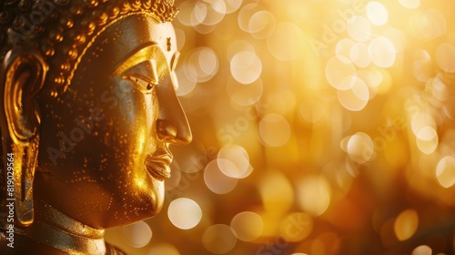 The serene golden Buddha statue, with a sparkling bokeh background, celebrating Visakha Bucha Day