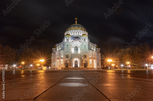 The St. Nicholas Wonderworker's Naval Cathedral in the night illumination close-up. Kronstadt, Russia