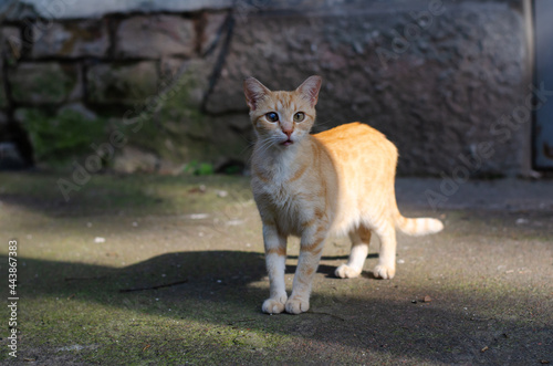 The street cat is walking. Yard spotted cat. A wandering pet. Pedigree pet for a walk.