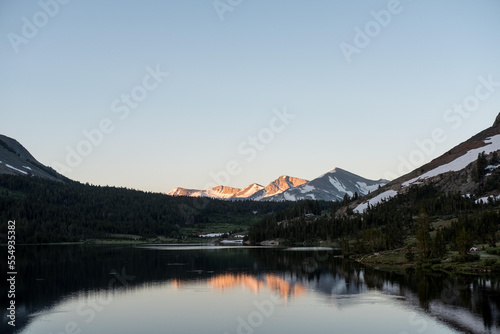 The sun illuminates mountains reflected in Tioga Lake.; Inyo National Forest, California, United States of America