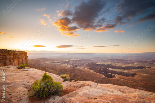 The sun peaks over the La Sal Mountains washing the canyon below in light.