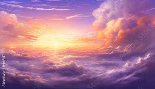 The sun rising over the clouds in the sky