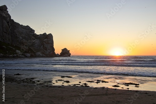 sunset, sea, sky, water, ocean, beach, sun, coast, landscape, rock, dusk, coastline, travel, seascape, shore, evening, orange, wave, california