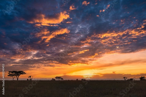 The sunrise panoramic view of Serengeti national park in Tanzania, Africa