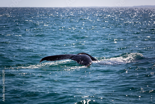 The tail of a humpback whale in the blue water of the coast of Australia