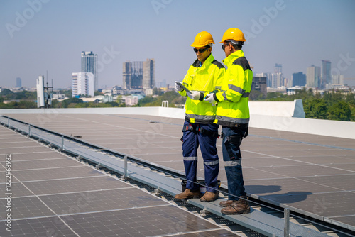 business, change, climate, colleague, color image, copy space, eco, ecosystem, efficiency, electrician, electricity, engineer, environmental, factory, futuristic, hard hat, headwear, helmet, horizontal, industry, innovation, installing, laptop, maintenance, male, man, manufacturing, occupation, panel, photo, photovoltaic, power, renewable, renewable energy, repairing, repairman, rooftop, safety, service, social issue, solar, solar panel, sunlight, sustainable, talking, teamwork, technician, technology, togetherness