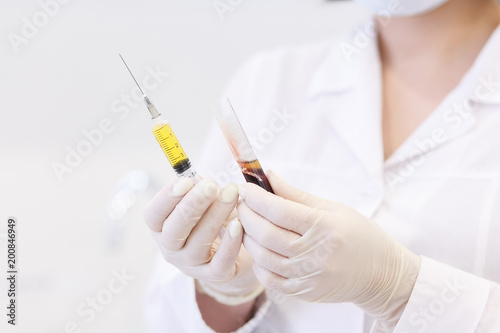 the uncertain doctor in medical gloves holds in hand syringe with plasma from test tube with blood the patient