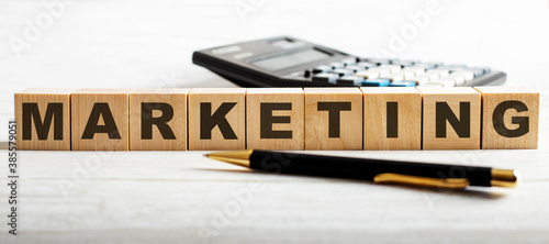 The word MARKETING is written on wooden cubes between a calculator and a pen. Business concept.