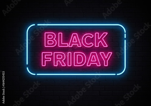 The words 'Black Friday' glow brightly in neon on a dark brick wall.