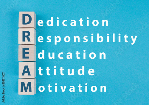 The words dream, dedication, responsibility, education, attitude and motivation are standing as a cross word on wooden cubes and paper, strategy to reach a goal