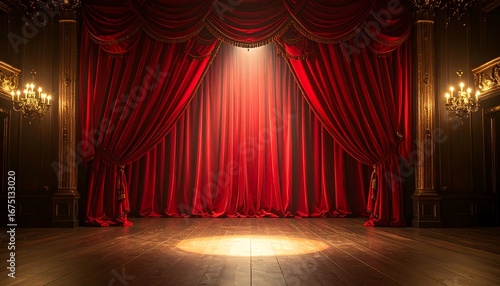 stage, theatre, curtain, red, velvet, spotlight, performance, drama, lighting, wooden, floor, grand, elegant, classic, auditorium, hall, scene, dark, light, illuminated, luxury, ambience, interior, show