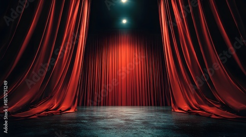 Theatrical elegance: Crimson curtains frame a stage bathed in spotlight, promising drama & spectacle. The rich fabric & stark lighting create a captivating visual. The stage is set!