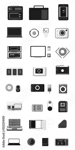 Theme: Electronics and Computers, Icon Set, Shapes, Objects, Black and White, on White Background, Abstract Image, Texture, Pattern Background, Wallpaper, Cover and Screen of Smartphone, PC, Laptop, 9