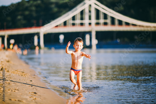 Theme summer outdoor activities near the river on the city beach in Kiev Ukraine. Little funny baby boy running along the river bank, jumping a splash of water sandy beach summer time