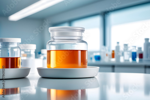 There are many medical petri dish neatly arranged on the white table, laboratory environment ,Many glass containers contain various liquids, scientific research and experimental materials