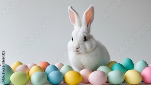there is a white rabbit sitting among a pile of colored eggs