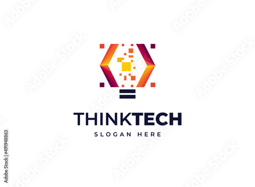 Think technology light bulb smart electricity idea vector logo design, Creative stack pixels tech particles icon logo design