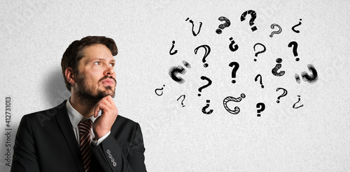 thinking businessman with many question marks on paper background