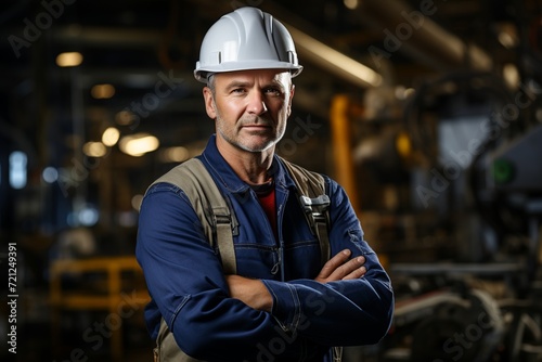 This captivating portrait showcases an industry maintenance engineer, dressed in a sharp uniform and wearing a safety hard hat, positioned at a factory station