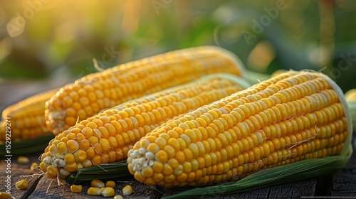 This close-up image showcases fresh corn cobs, their bright yellow kernels glistening in the sunlight, representing the bounty of nature and the joy of harvest season.