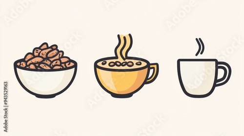 This collection features minimalist line icons of a bowl of nuts, a steaming bowl of soup, and a coffee cup