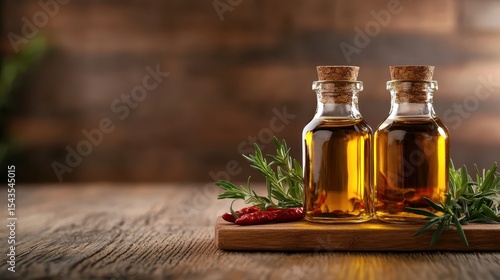 This elegant image showcases artisanal bottles of olive oil adorned with herbs, portraying sophistication in culinary practices and emphasizing the beauty of natural ingredients.