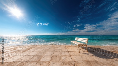 This image beautifully presents a solitary bench by the shore, inviting contemplation with stunning ocean views under a bright blue sky and shimmering sunlight.