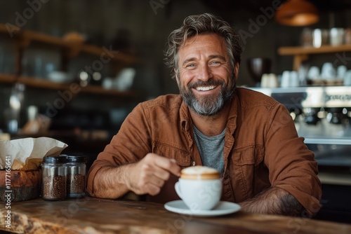 This image captures a joyful man sitting at a wooden table, savoring a warm cup of coffee in a stylish café with natural lighting and a rustic ambiance.