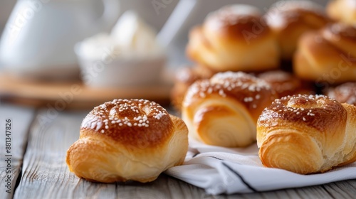 This image captures golden-brown pastry rolls topped with sugar crystals, illustrating a delectable baked treat that's perfect for any sweet tooth, served elegantly on a wooden surface.