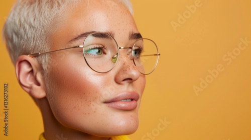 This image features a person with short hair, wearing glasses and a high-necked top. The individual appears to be a woman with a neutral expression, set against a vibrant yellow background.