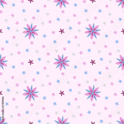 This is a seamless pattern with pink-purple flowers are surrounded by small colorful flowers on a light pink tone background. That looks great and beautiful.