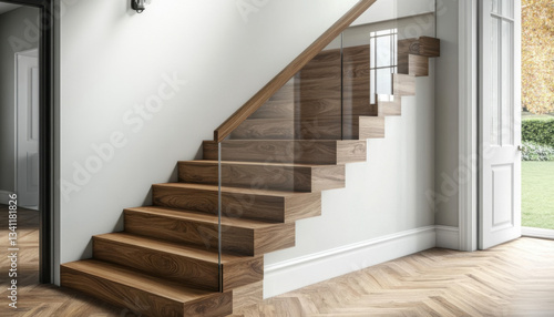 This modern wooden staircase features sleek glass railings that enhance the openness of a stylish home interior. Natural light flows through large windows, highlighting the design