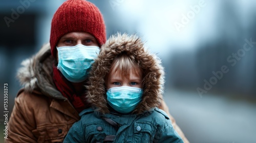 This powerful image captures a father and child together, both wearing protective masks, emphasizing the importance of health and togetherness during cold times.