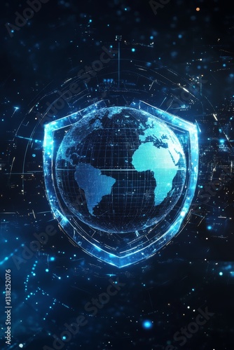 This striking image features a digital shield encasing the Earth, symbolizing global cybersecurity in a futuristic digital landscape with vibrant blue tones.
