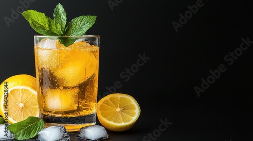 This vibrant image features a refreshing cocktail in a glass, beautifully garnished with mint and lemon slices, exuding summer vibes and a sense of relaxation and enjoyment.