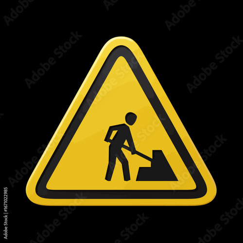 This yellow triangular warning sign, featuring a black silhouette of a person shoveling, effectively conveys ongoing construction or maintenance, isolated on a dark background.
