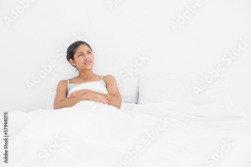 Thoughtful casual woman looking up in bed