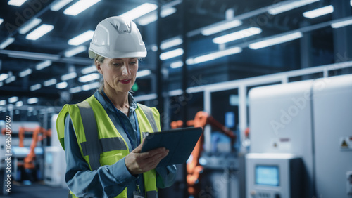 Thoughtful Caucasian Female Engineer Walking with a Tablet Computer, Monitoring Conditions at an Automated Industrial Machinery Assembly Line with Robot Hands Powered By Artificial Intelligence.