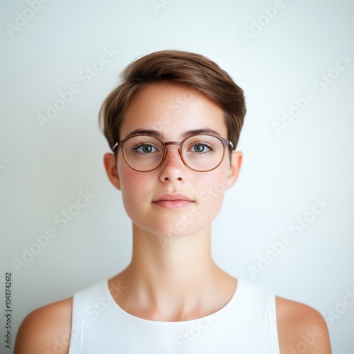 woman, portrait, goggles, thoughtful, serious, face, white background, studio shot, young adult, casual clothes, brunette, blue eye, head shot, beauty, fashion, style, contemplative, professional, modern, minimalist, elegant