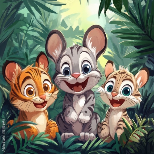 tiger, baby animal, kitten, cat, jungle, leaf, animal, baby, cute, adorable, wildlife, forest, green, foliage, tropical, happy, friends, playful, innocent, small, young, mammal, nature, wild, cartoon, illustration, drawing, art, digital, painting, image, graphic, design, vibrant, bright, colours, scene, background, fun, joyful