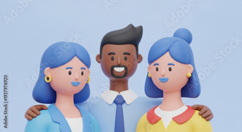 Three Animated Characters, a Man and Two Women, Smile Together, Showcasing Diversity and Teamwork in a Light Blue Backdrop