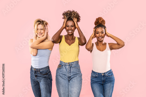 smiling, friendship, happy, social, beauty, african, afro, american, background, beautiful, brown, caucasian, cheerful, connection, copy space, different, fun, blond, pink, pastel, colours, student, diverse, female, girl, global, gorgeous, indoor, interracial, isolated, joyful, lady, model, multicultural, multiracial, nation, natural, portrait, posing, race, racial, skin, studio, three, together, type