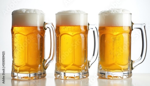 Three beer glasses with lager beer isolated on white background. Alcoholic beverages, pub drink, cool refreshment. Draft gold liquid in transparent mugs full of foam, froth. Still life. Brewed cold