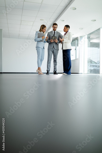 Three business colleagues discussing work related matters on an office building hallway. Team work.