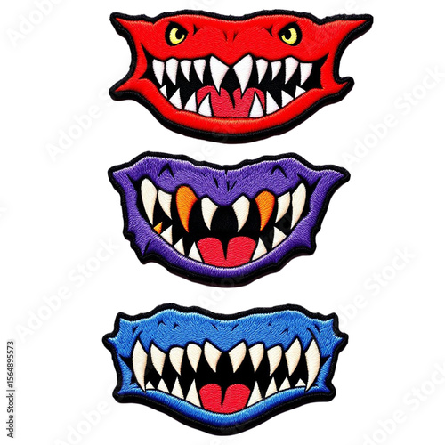 patch, embroidered, teeth, red, purple, blue, black background, monster, mouth, fang, textile, sewing, craft, cartoon, design, isolated, artwork, creature, fantasy, horror, halloween, graphic, illustration, symbol, decorative, art, embroidery, sew on, fabric, apparel, clothing, accessory, badge, motif, colourful, vibrant, detailed, closeup, stacked, vertical