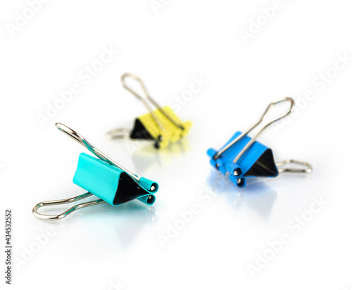Three colorful paper clips binder isolated on white background with reflection, stationery photo