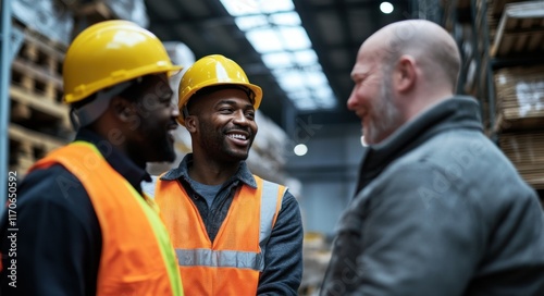 Three construction workers in their thirties, one Black man with short hair and a mustache wearing an orange safety vest, smiling at each other as they stand next to the corner of a large warehouse.