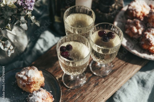 birthday, celebration, crystal, goggles, drink, snack, flower, table, wooden, gathering, party, friends, food, bubbly, clear, grape, festive, decorated, joyful, happy, sweet, plate, treat, cupcake, surface, event, outdoors, drink, toast, atmosphere, board, cooked, social, leisure, hours, cake, refreshment, berry, floral, arrangement, serving, joy, homemade, dessert, special, occasion, moment, fun, clinking