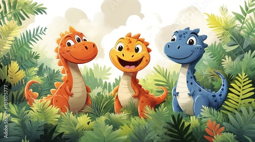 Three cute baby dinosaurs in lush jungle.