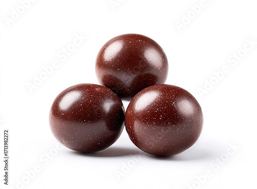 chocolate, ball, sphere, dark, brown, glossy, speckled, candy, sweet, treat, dessert, food, tasty, delicious, round, smooth, triangle, arrangement, isolated, white, background, studio, closeup, macro, food photography, sweet, brownie, confectionery, ball-shaped, composition, image, product, detail, closeup, premium